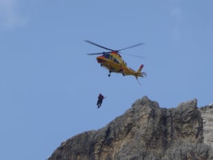 Finalmente l’elicottero si ferma, immobile in aria. La manovra è chirurgica: da un’altezza che può essere di qualche decina di metri il Tecnico si cala appeso al verricello. Ci può essere vento in parete, c’è l’aria spostata dal rotore. Ma occorre arrivare accanto alla persona. Millimetrici. Millimetrici e rapidi: svincolare il ferito dalla parete, legarlo al sistema di aggancio su cui è già appeso il soccorritore e subito via.